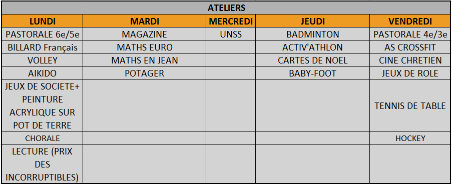 Les professeurs du collège permettent aux élèves déjeunant à la cantine de participer à différents ateliers tout au long de la semaine. Bénévolement, les professeurs proposent, selon leurs passions, des activités en lien ou non avec leurs matières.